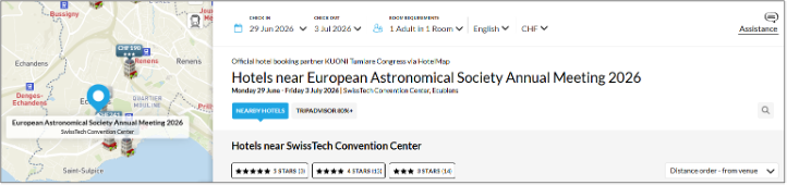 Important information on unsolicited requests for hotelsThe EAS strongly recommends booking accommodation for EAS 2026 exclusively through our official partner, Kuoni Tumlare Congress, via the HotelMap booking platform. Please exercise caution if you receive unsolicited offers for hotel rooms or other services, or unsolicited phone calls asking to confirm your hotel reservations. We strongly advise against engaging with these companies, as we cannot accept responsibility for any adverse consequences resulting from such interactions. For any questions or concerns, please contact Kuoni Tumlare Congress at eas2026@kuonitumlare.com. |