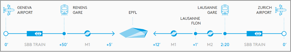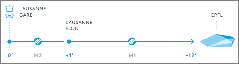 From Lausanne City Centre:From Lausanne-Flon, take Metro M1 toward Renens and get off at EPFL. Depending on your location in Lausanne, you may also need to take buses or the Metro M2 (e.g., from Lausanne train station) to Lausanne-Flon.