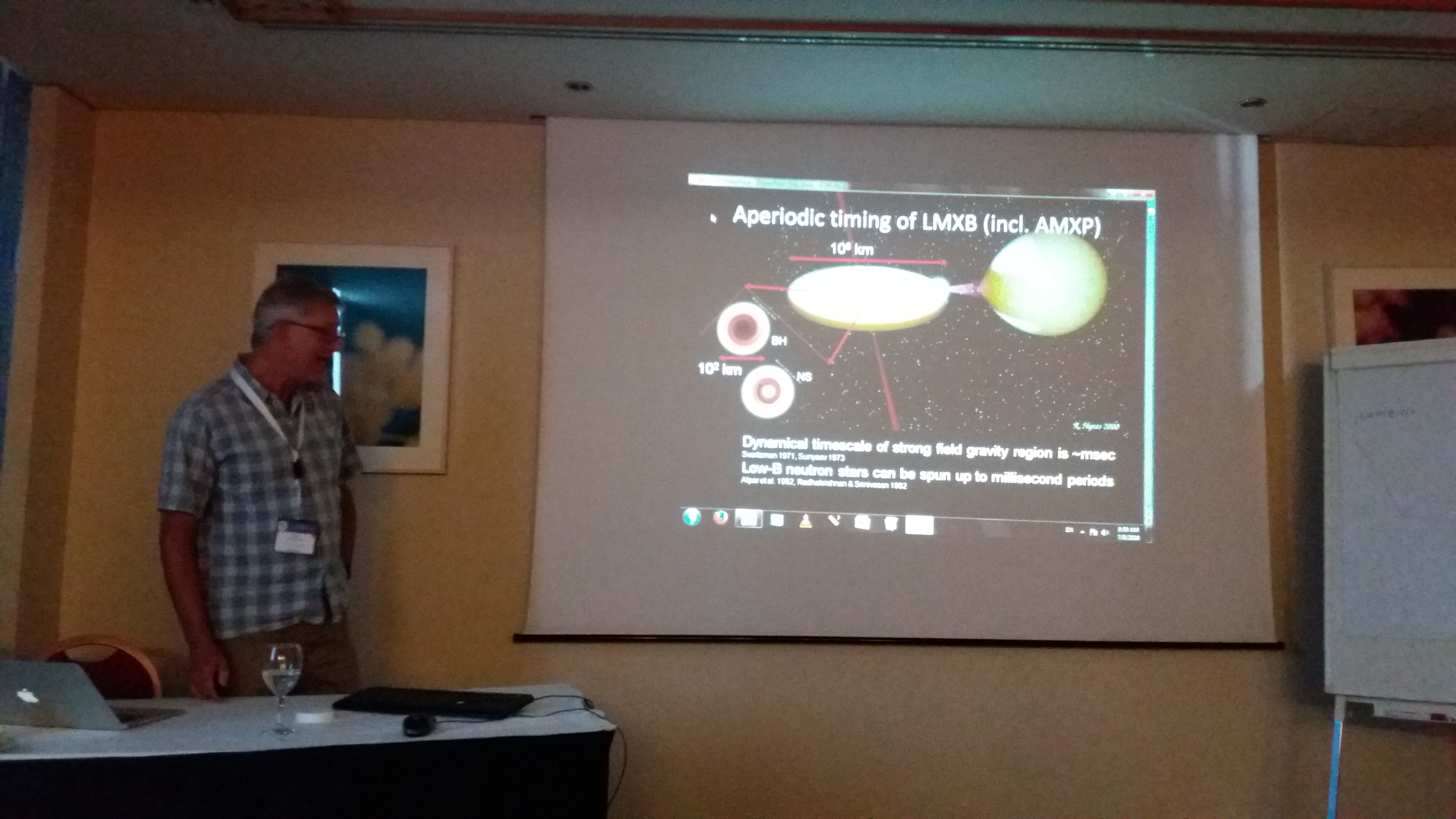 Michiel van der Klis giving his invited review talk on "Timing Low-Mass X-Ray Binaries and Accreting Millisecond Pulsars". (Credit: Konstantinos Gourgouliatos) The main topic of session 3 was the evolutionary paths from Low Mass X-ray Binaries to Millisecond Pulsars, which was reviewed by Francesca D'Antona. Chengmin Zhang showed simulation of how accretion transform NS into millisecond pulsars, while Diego F. Torres presented an observational review of the gamma-ray emission from accreting and transitional pulsars, redbacks, and black widows. The contributed talk by Jonay I. Gonzalez-Hernandez on spectroscopic optical observations of the orbital evolution in black hole X-ray binaries closed the session. Session 4 started with Michiel van der Klis reviewing the timing properties of Low-Mass X-Ray Binaries and Accreting Millisecond Pulsars. The invited talks by Andrea Possenti and Domitilla De Martino highlighted the radio properties of transitional and radio millisecond pulsars. The session ended with the contributed talk by Andrea Sanna on the orbital evolution of the accreting millisecond X-ray pulsar SAX J1808.4-3658. Present and Future X-ray missions are of fundamental importance for the study of spectral and timing properties of Low Mass X-ray Binaries. For this reason, Session 5 was devoted to this topic, where Giorgio Matt and Marco Feroci reported on future missions of X-ray polarimetry and the status and perspectives of several missions, namely LOFT, eXTP, LOFT-Probe, MVN-M2 and the possible advancements in our understanding of the compact objects systems and their physical conditions. The final session dealt with the spectral properties and reflection features of Low Mass X-ray Binaries. Edward Cackett provided a detailed review on spectral studies of Low Mass X-ray Binaries and Accreting Millisecond Pulsars. Mariano Mendez presented an interesting evidence of a resonance mechanism leading to the formation of kHz QPOs. Teo Munoz-Darias suggested a common accretion state scheme for both neutron star and black hole systems. Subsequent contributed talks by Tiziana Di Salvo (Alessandro Riggio), Nikolaos Kylafis, Enrico Bozzo, and Carlo Ferrigno on observational spectral analysis and modelling of Low Mass X-ray Binaries closed the session. More info about this symposium may be found here. Konstantinos Gourgouliatos (Department of Applied Mathematics, University of Leeds, UK) Alessandro Riggio (University of Cagliari, Italy) Contributed News