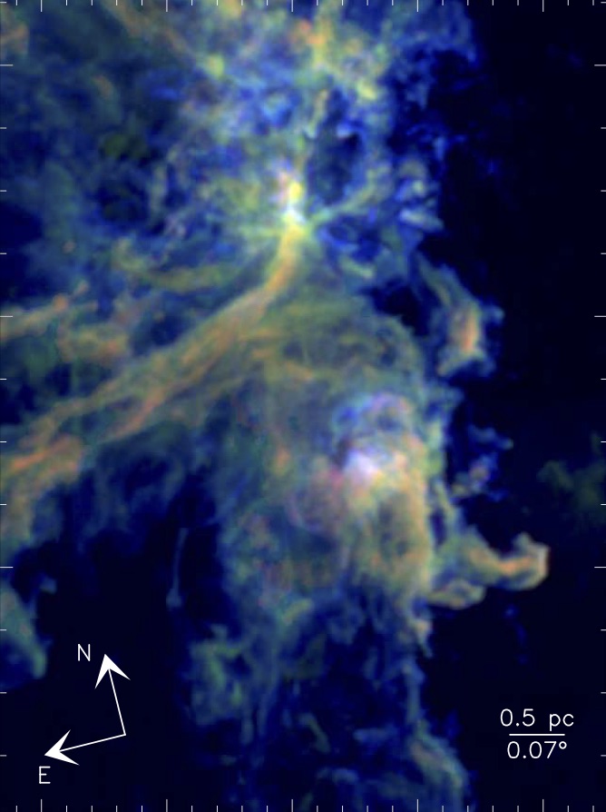 A false colour RGB image (12CO=blue, 13CO=green, C18O=red) showing the peak intensities of the 12CO (blue), 13CO (green) and C18O (red) J=1-0 transitions of Orion B. The data were taken with the IRAM-30m telescope. (Credit: Jerome Pety) The invited and contributed presentations discussed the physics of turbulence in the interstellar medium in the Galaxy as well as in external galaxies, and the relation with the star formation rate at small and large scales. New observations of the bistable nature of the atomic gas were presented that highlight the need for a deep understanding of the heating processes. The couplings of the physical structure of the matter with the small scale processes was presented, with the emphasis put on the impact of turbulence on the formation and spatial distribution of the simple molecules CO and H2. The reactive ion CH+ was the focus of another presentation because this ion is one of the best tracers of the dissipation regions of the turbulence. The new perspectives on the structure and intensity of the magnetic field gained from the Planck Surveyor mission were presented. Individual contributions discussed the properties of the field in specific regions of the sky as probed by ground based polarimetry observations, and the information on the field fluctuations accessible from large scale surveys of the polarised synchrotron emission.