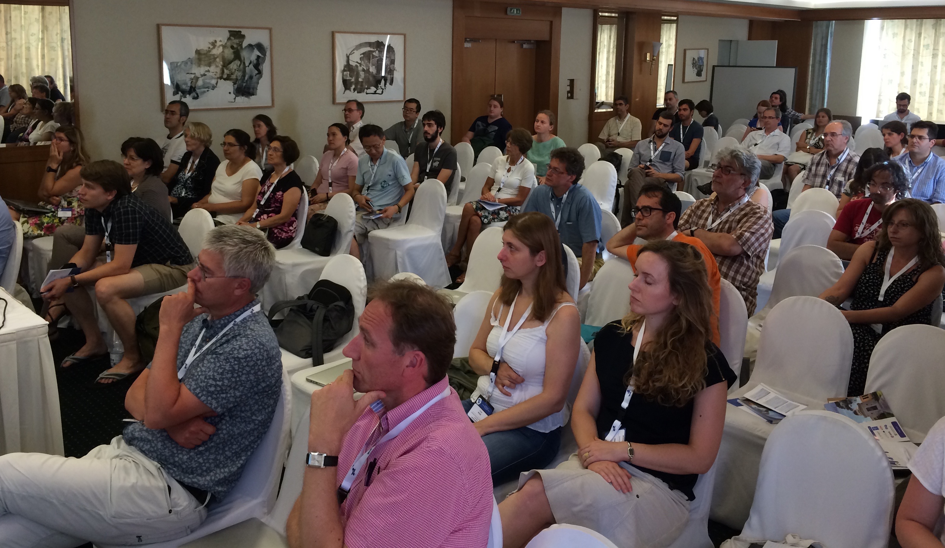 A view of the audience during one of the talks at Symposium S1. Session 4 was dedicated to science on transients with Gaia. Hodgkin presented the status of the Gaia photometric alerts effort, summarising the properties of the alerts published to date and showing the latest evolution of the alerts tools for users. Blagorodnova discussed in more detail the classification of transients based on Gaia's BP/RP spectra. Jonker discussed the prospects for discovering white dwarf tidal disruption events with Gaia, while Wyrzykowski discussed the possibility of Gaia discoveries of TDEs around supermassive black holes. Roelens provided insights into the way short time scale variables are identified and characterised in the DPAC pipelines and Tanga discussed the identification and processing of solar system objects by Gaia, including the option to alert on newly discovered near earth objects. Session 5 contained presentations on the preparations for the scientific exploration of Gaia data. The possibilities for extragalactic science were discussed by Kontizas. Marchetti presented his machine learning algorithm for the search for hypervelocity stars in the Gaia data, which he plans to test extensively on Gaia DR1. The synergies between optical and radio astrometry were discussed by Forbrich. Vickers presented methods to determine stellar ages from the combination of Gaia and LAMOST data, and the session was closed by Poggio with a discussion on the study of the Galactic warp with Gaia data. Session 6 focused on the distance scale which is of course expected to undergo major improvements with future Gaia data releases. The expected improvements in the physics of Cepheids and RR Lyrae variables was discussed by Marconi, while Kervella focused on the synergy between Gaia measurements of Cepheids and optical interferometry of those stars. Anderson presented his efforts at cleaning up calibration samples for the Cepheid Period-Luminosity relation through the use of radial velocities to weed out binaries. The Cepheids and RR Lyrae in the Magellanic clouds were discussed by Ripepi and Muraveva, respectively. Ruiz Dern closed the session with a discussion on the future calibration of the Red Clump star luminosities with Gaia. Session 7 contained presentations on synergies between Gaia and other surveys and on new astrometric instrument initiatives. Cellino discussed ground based observations that are needed to complement Gaia's observations of minor bodies in the solar system. Ranalli presented an in-depth study of the detection and characterisation of exoplanets with Gaia, noting the benefits of extending the Gaia mission for the study of long-period systems. Vallenari presented an overview of the synergies between ground and space for open clusters studies and provided a preview of the improvement in the study of internal cluster kinematics with Gaia, showing a comparison of Tycho-2 and Gaia DR1 proper motions. Athanassoula discussed N-body models for our Galaxy in the context of future Gaia data releases. Feltzing discussed ground based spectroscopy projects aimed at complementing Gaia, in particular 4MOST and WEAVE. The session was closed by a presentation from Leger on the proposed astrometry mission Theia, which aims at sub-microarcsecond differential astrometry.
