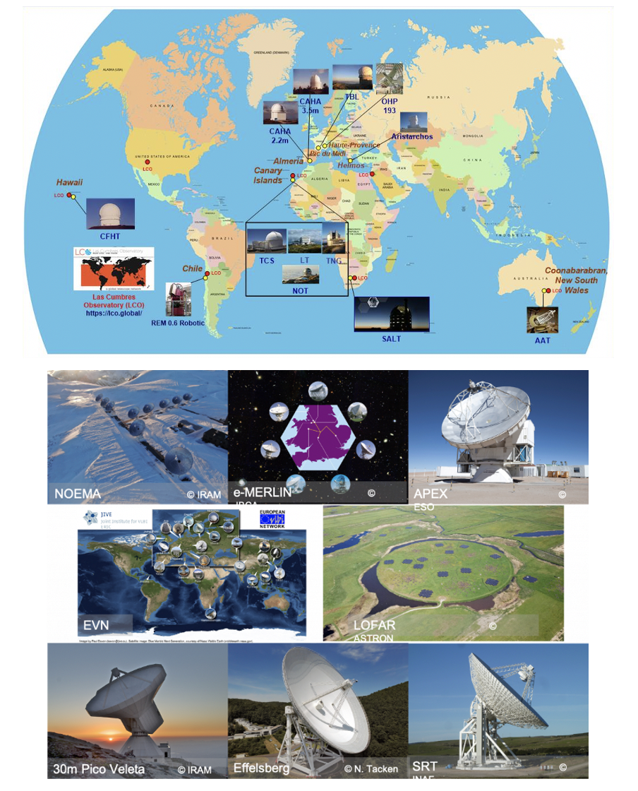 Optical and radio telescopes participating to the ORP programme. Access to Europe's largest and most powerful radio telescopes and arrays, from sub-mm to metre wavelengths will be offered via a converging proposal process, with the ultimate aim that the same mechanism can be used to apply to all ORP facilities. These facilities include large single dishes (Effelsberg, SRT , 30m Pico Veleta and APEX) and powerful arrays at all wavelengths: the European VLBI Network, LOFAR, e-MERLIN, and NOEMA. Archive access will be enabled for the WSRT survey system Apertif, (ALTA) and the LOFAR Long Term Archive (LTA) through the virtual access process. The European ALMA users will be supported at all stages from conception of a scientific objective to publication of the results through transnational access to the European ARC network (ARC), including the visits at ARCs. Time domain astronomy will benefit from virtual access to a large and growing suite of small and medium sized optical, infrared and potentially radio facilities combined with new tools to identify, prioritise and co-ordinate observations of transients and sources meriting long time monitoring. A key tool for this will be a Target Observation Manager which is an interface for viewing and sharing photometric and spectroscopic data of time-domain targets. A dedicated activity will offer transnational access to the CANARY adaptive optics testbed at the 4.2m William Herschel Telescope providing both telescope time and technical support to AO experiments needing on-sky testing to show proof of concepts for new ideas. Optical interferometry will be supported by both new tools for access to and data reduction for instruments such as the GRAVITY and Hi-5/Viking instruments at the VLTI. This will be complimented by training schools and a network of VLTI expertise centres modelled on the ALMA regional nodes. ORP will also address the increasing threat to both optical and radio astronomy from new mega-constellations of low-orbit satellites designed to provide ubiquitous internet coverage. The work will include quantification and mitigation of the impact as well as policy issues in both the optical and radio domains. You can learn more about the ORP by visiting its website or attending the session to take place at the virtual EAS Annual Meeting in June. This project is funded under the European Union's Horizon 2020 research and innovation programme under grant agreement No 101004719. The ORP Team
