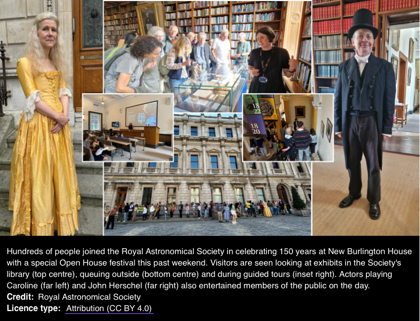 The RAS is the oldest astronomical society in the world, founded in 1820 with the aim of promoting the study of astronomy, solar system science, geophysics and related branches of science. This year, the RAS celebrated 150 years at Burlington House, the official site of the RAS in central London. An open house festival was held in September, celebrating the event that included a visit to the library with some of its treasures on display: observation notebooks of Caroline and John Herschel, or a first edition of Newton's "Principia". The event included the presence of the Herschels themselves (actors of course !), and was attended by hundreds of people. This event coincides with the great news that the lease of Burlington House has been extended for another 999 years (!) allowing the RAS to keep such an iconic site. More information can be found at the