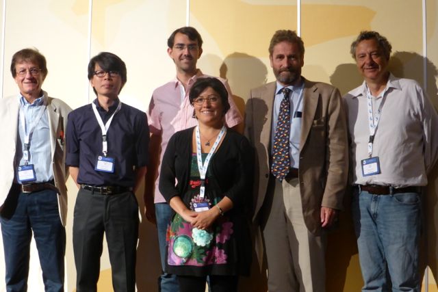 Group picture taken at EWASS 2014 in Geneva, Switzerland. The MERAC prize laureates are surrounded by Francesco Palla, chair of the prize committee (left), Thierry Courvoisier (EAS President) and George Lake representing the FONDATION MERAC (right).