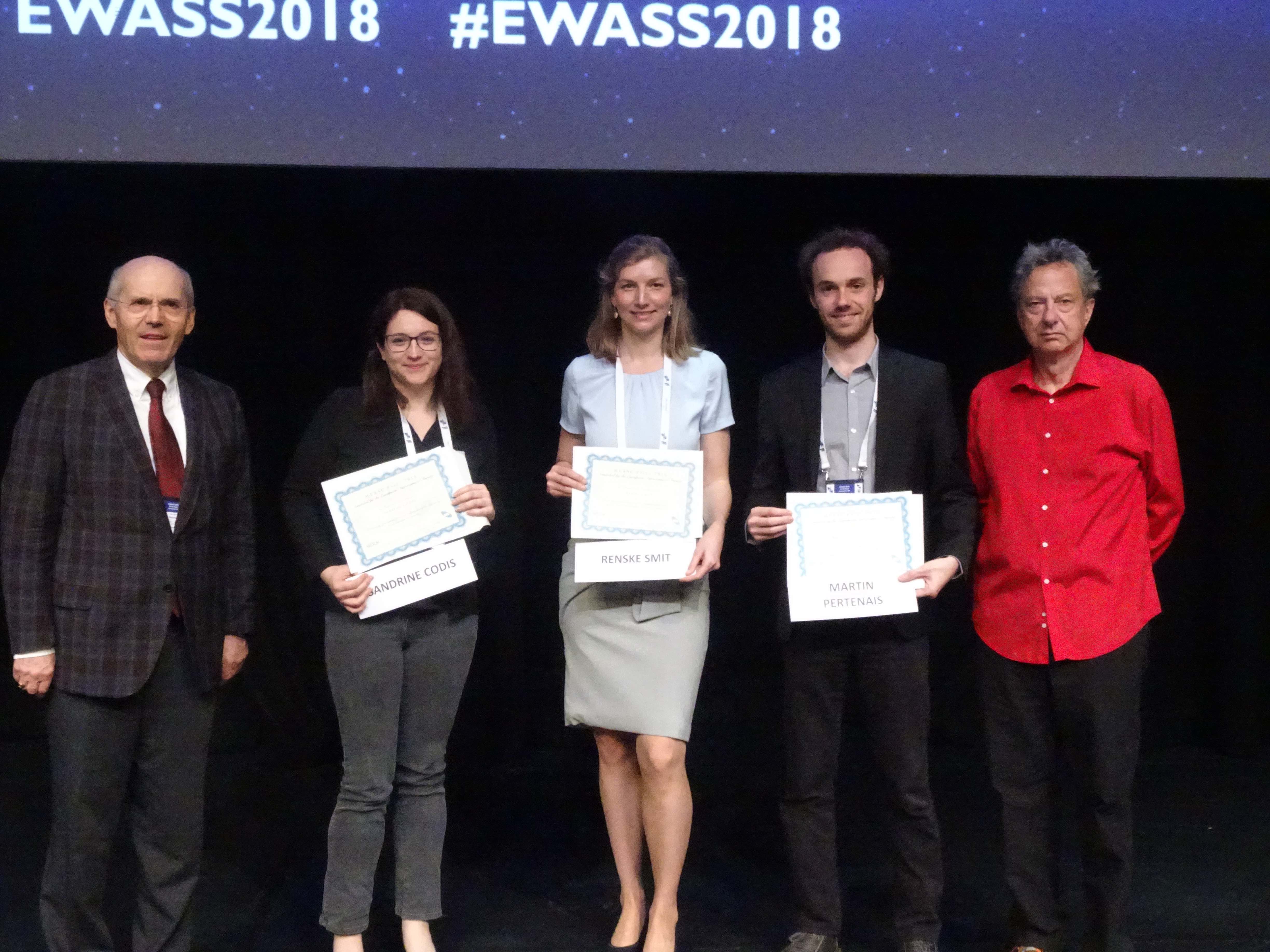 Group picture taken at EWASS 2017 in Prague, Czech Republic marking the 5-year jubilee of the MERAC Prizes. The laureates are surrounded by George Lake (far left), Jean-Marie Louzier (left), and Carl Stadelhofer (right) all from the FONDATION MERAC, together with the EAS President, Thierry Courvoisier (far right).